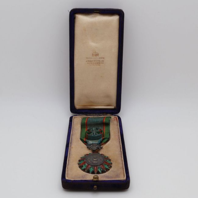 An Officer Grade badge of the Thai Order of the Crown, Type I, made in silver by Benson, London. The medal comes in its original presentation case.