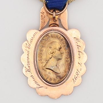 A rare United States Society of the Sons of the Revolution membership badge, made in 14k gold by Bailey Banks & Biddle, weighing 17.38 grams. The reverse is engraved with "James Harwood Glasson", "October 7 1897", "2524", and the maker’s mark "Bailey, Banks & Biddle".