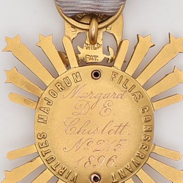 A rare United States National Society of the Colonial Dames of America medal, crafted in solid 14k gold and weighing 14.13 grams. It features a "Connecticut" top bar, and the reverse is engraved "Margaret D.E. Chislett, No. 215, 1896."