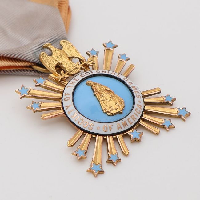 The National Society of the Colonial Dames of America was founded to honor descendants of early American colonists and promote the preservation of historical sites and artifacts. Medals like this were issued to members to recognize their lineage and dedication to historical preservation.