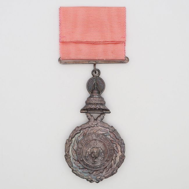 Instituted in 1873 by King Chulalongkorn (Rama V) to honor members of the royal family, government officials, and military personnel for distinguished service to the monarchy and the state. This medal is made from silver and features blue enamel highlights.
