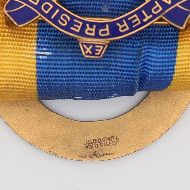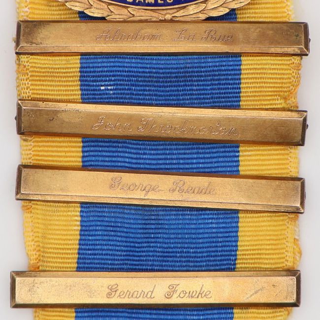 A rare United States National Society of the Colonial Dames XVII Century medal, made from rolled gold and maker marked "J.E. Caldwell". Features five ribbon clasps: "Heraldry", "Abraham La Rue", "John Throckmorton", "George Reade", and "Gerard Fowke".