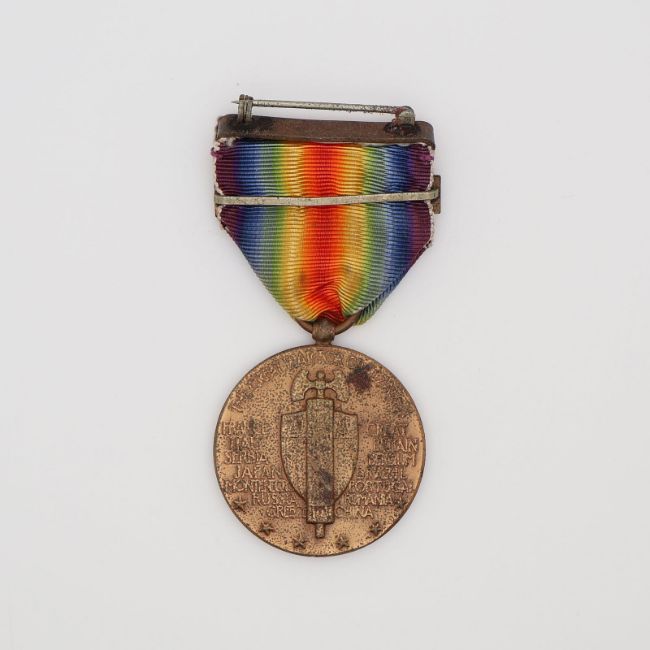 The World War I Victory Medal was presented to U.S. military personnel who served in a war zone between 1917 and 1918. The "Grand Fleet" ribbon bar signifies service with the British led Grand Fleet, recognizing American sailors who contributed to combined Allied naval efforts in the Atlantic and North Sea during the conflict.